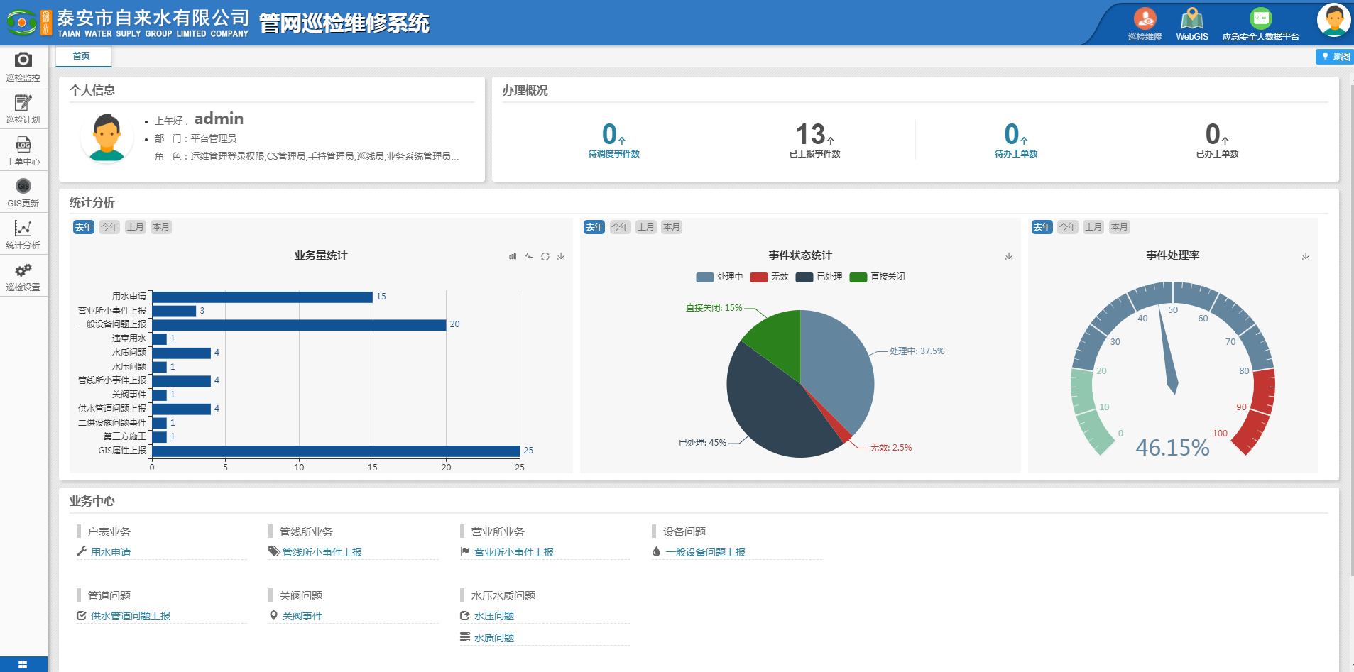 ????????公司領導組織有關部門、人員對供水GIS系統(tǒng)建設進行了認真細致的考察、調(diào)研,對公司業(yè)務流程梳理及系統(tǒng)接口需求進行了溝通整理。公司供水GIS系統(tǒng)包含四大模塊,有供水管理地理信息系統(tǒng)C/S(內(nèi)網(wǎng)系統(tǒng))、供水管網(wǎng)地理信息系統(tǒng)B/S(網(wǎng)頁客戶端)、供水管網(wǎng)巡檢系統(tǒng)、供水管網(wǎng)維修系統(tǒng),四大模塊中包含數(shù)據(jù)管理、數(shù)據(jù)分析、工單系統(tǒng)、巡線管理、移動終端監(jiān)控、運維管理等46項功能。項目自2020年4月初正式啟動, 2020年6月中旬完成四大模塊搭建及相關功能調(diào)試。