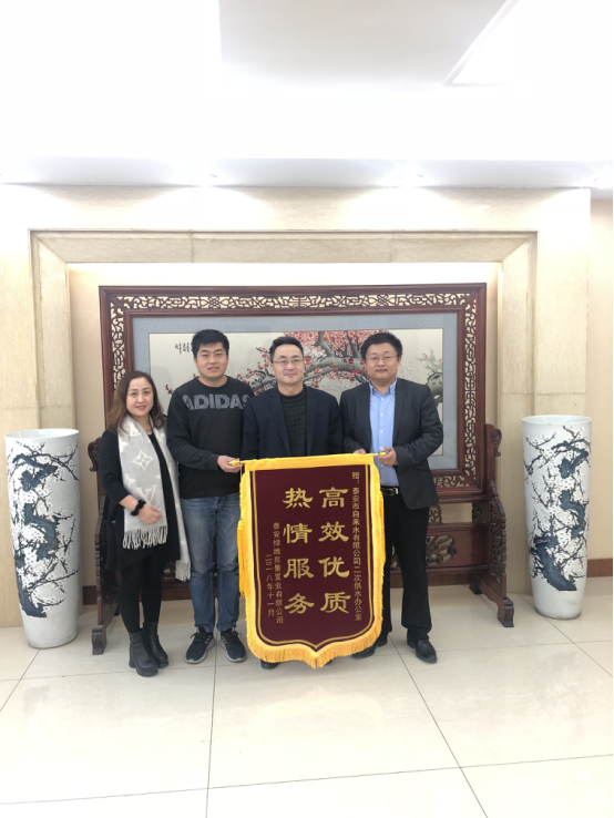 11月15日,泰安綠地泉景置業(yè)有限公司韓總一行來公司將書有 “熱情服務(wù)高效優(yōu)質(zhì)”的錦旗送到公司黨委委員、紀(jì)委書記暴勇生的手中,代表綠地云水謠項目全體人員對公司的供水服務(wù)表示感謝。