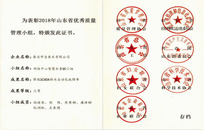 據(jù)悉,我公司是本次唯一一家獲此省級(jí)殊榮的供水企業(yè),填補(bǔ)了我公司在山東省省級(jí)質(zhì)量管理成果方面的空白。